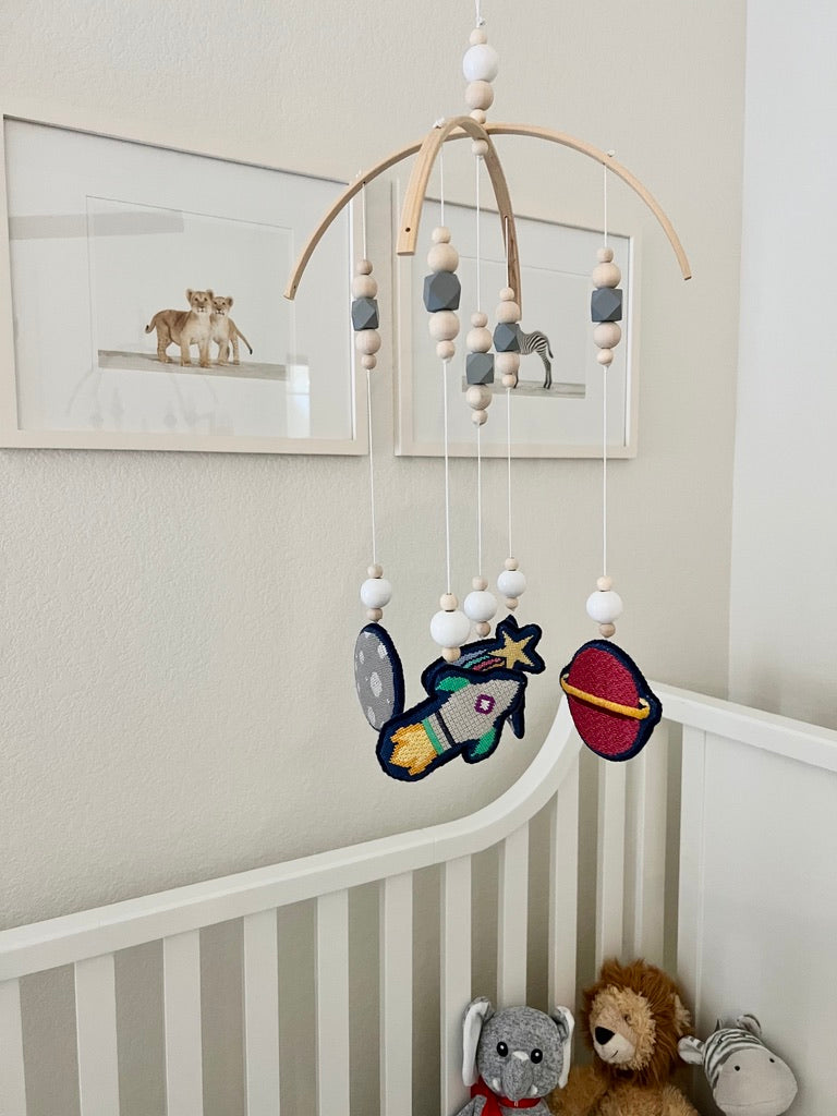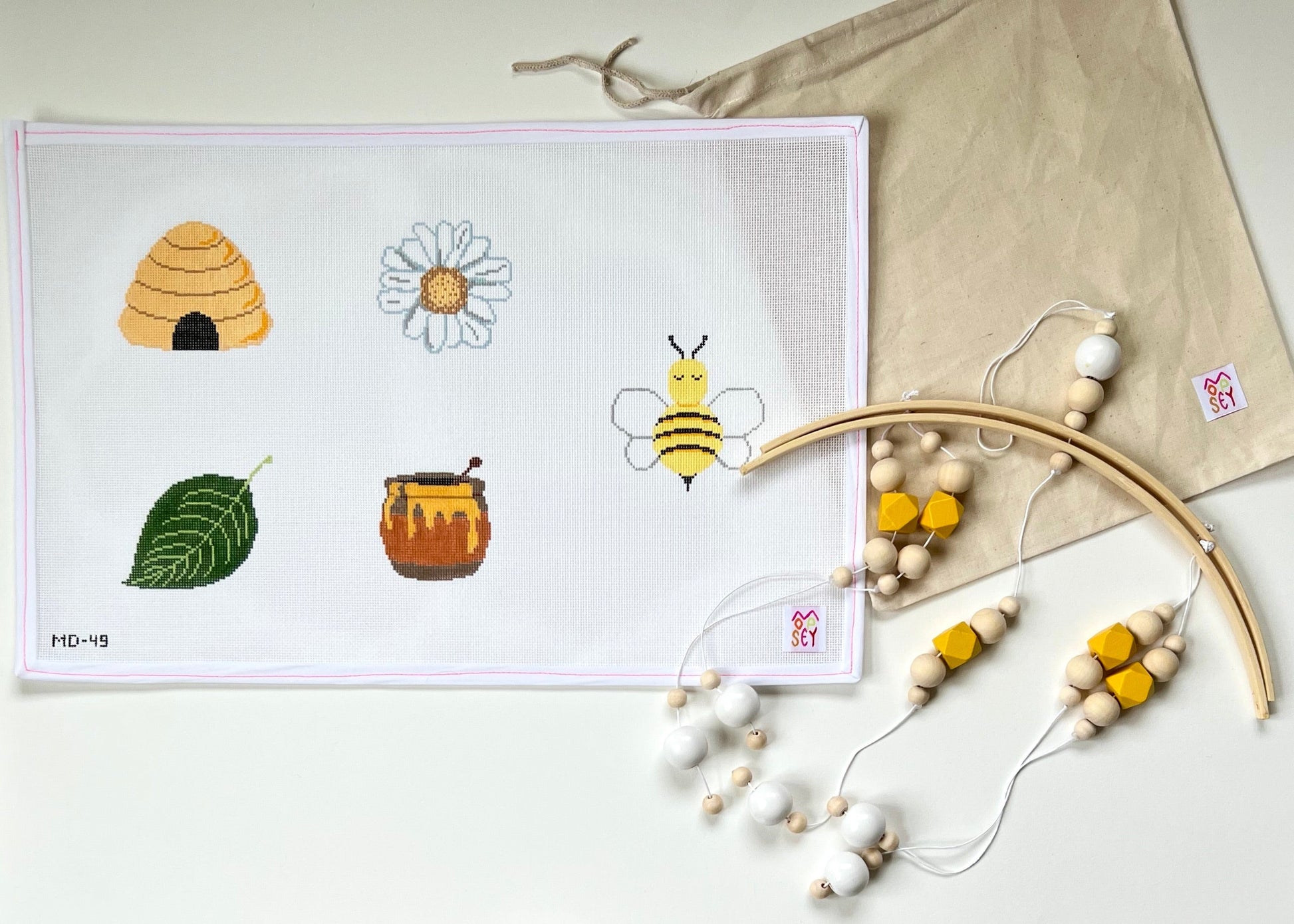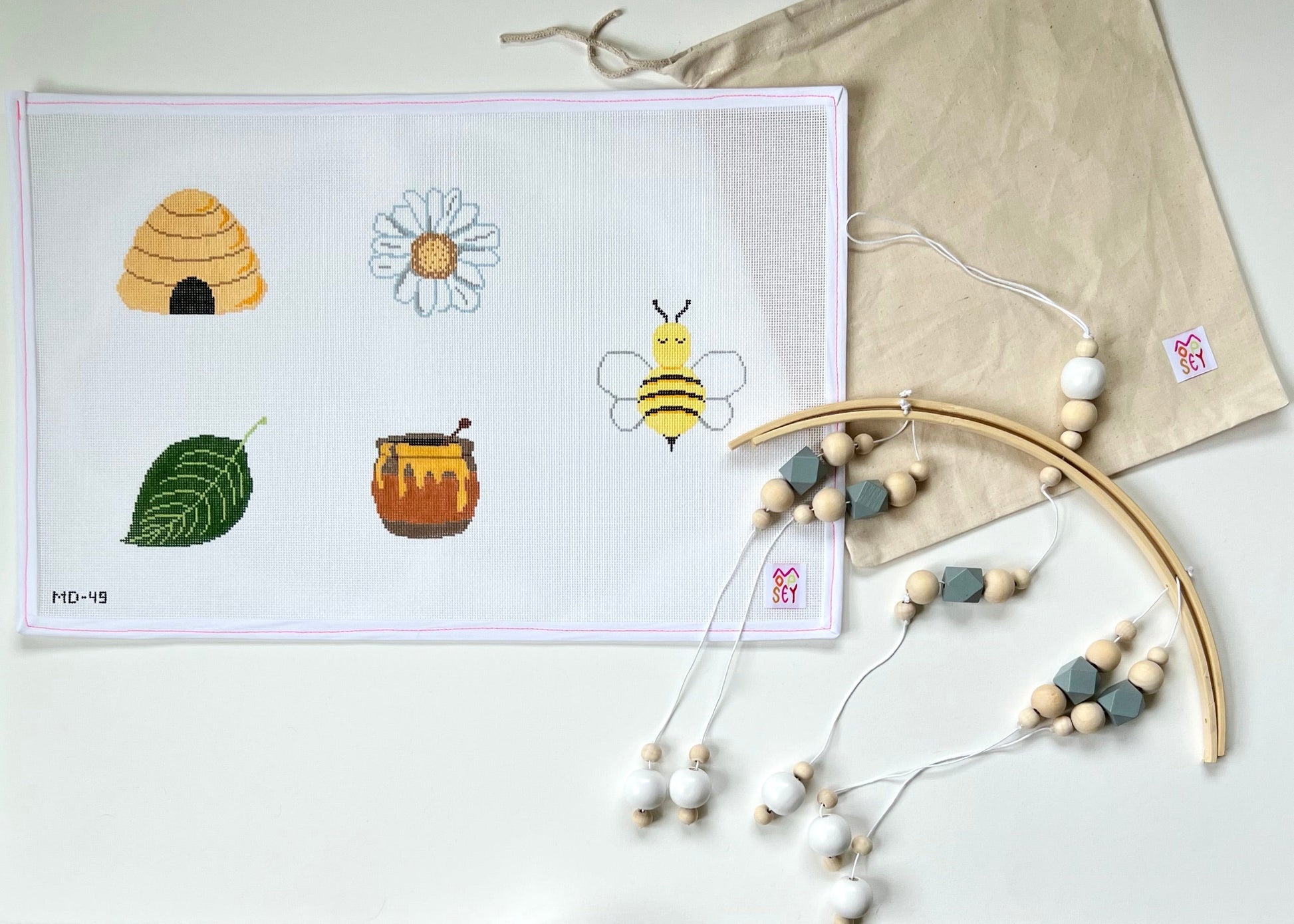 Needlepoint mobiles are here! This is sold as a kit, you will receive the canvas and hardware of your choosing. To have it finished, request a finisher to make flat-back ornaments (with or without a loop) and to attach to the bottom bead of each string on the mobile hardware!