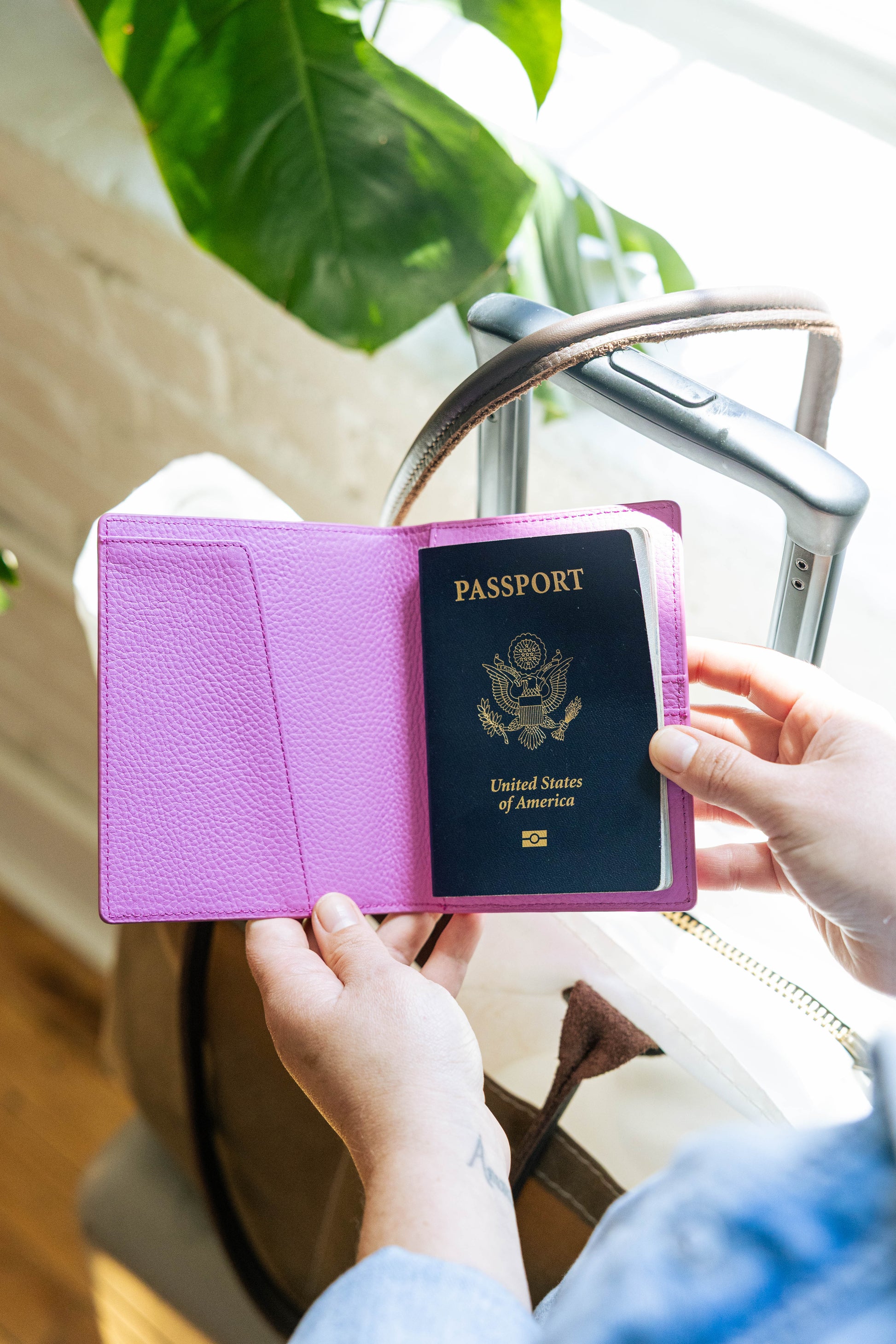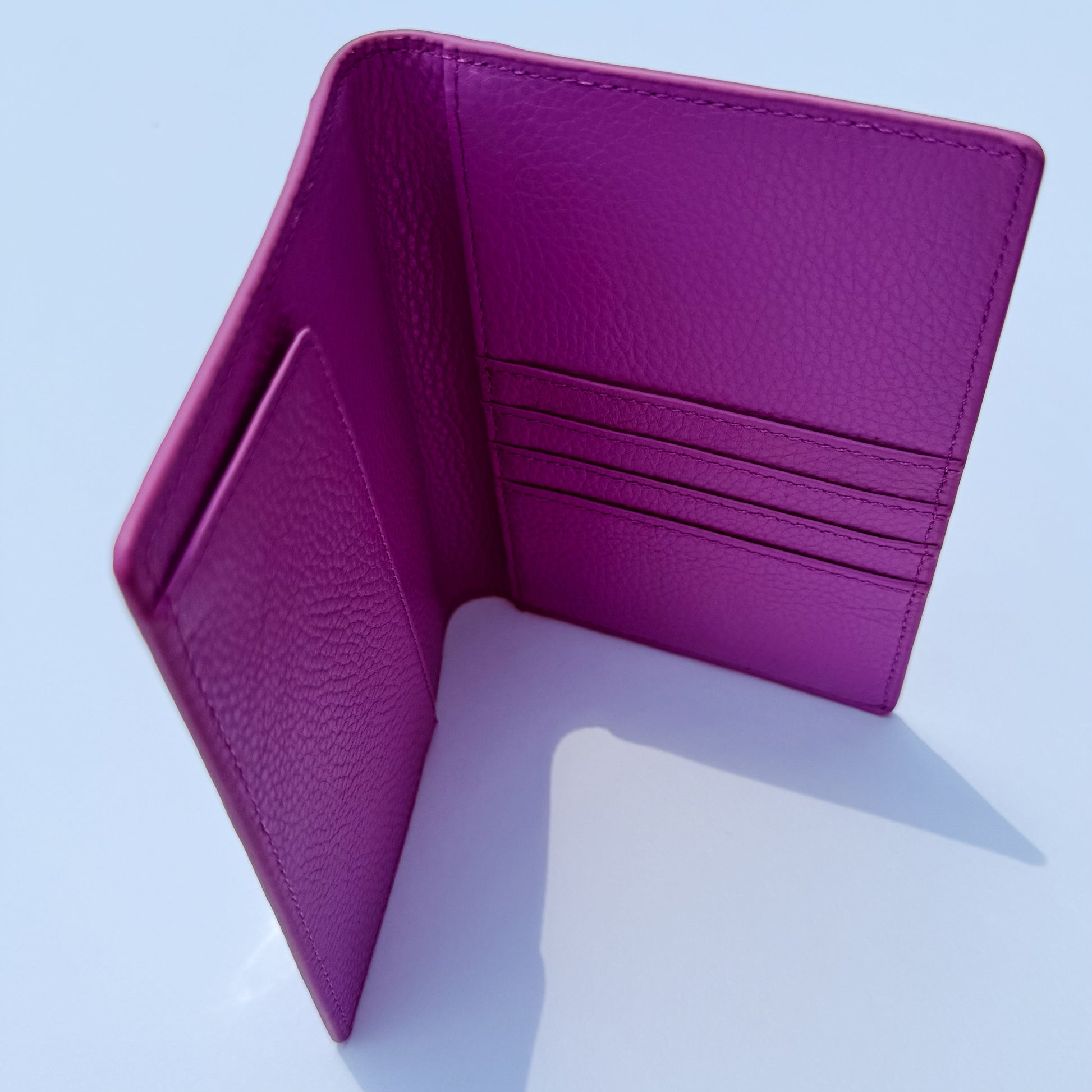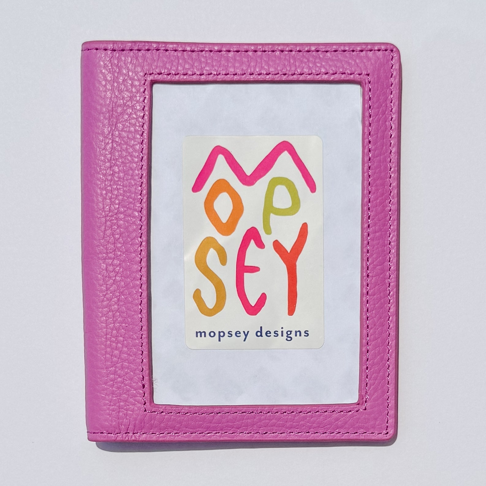 This gorgeous self-finishing passport cover is the perfect option for the traveler! The exclusive Mopsey Magenta passport cover is genuine leather and fits a 3" x 4.5" insert and has 4 card slots in the interior.