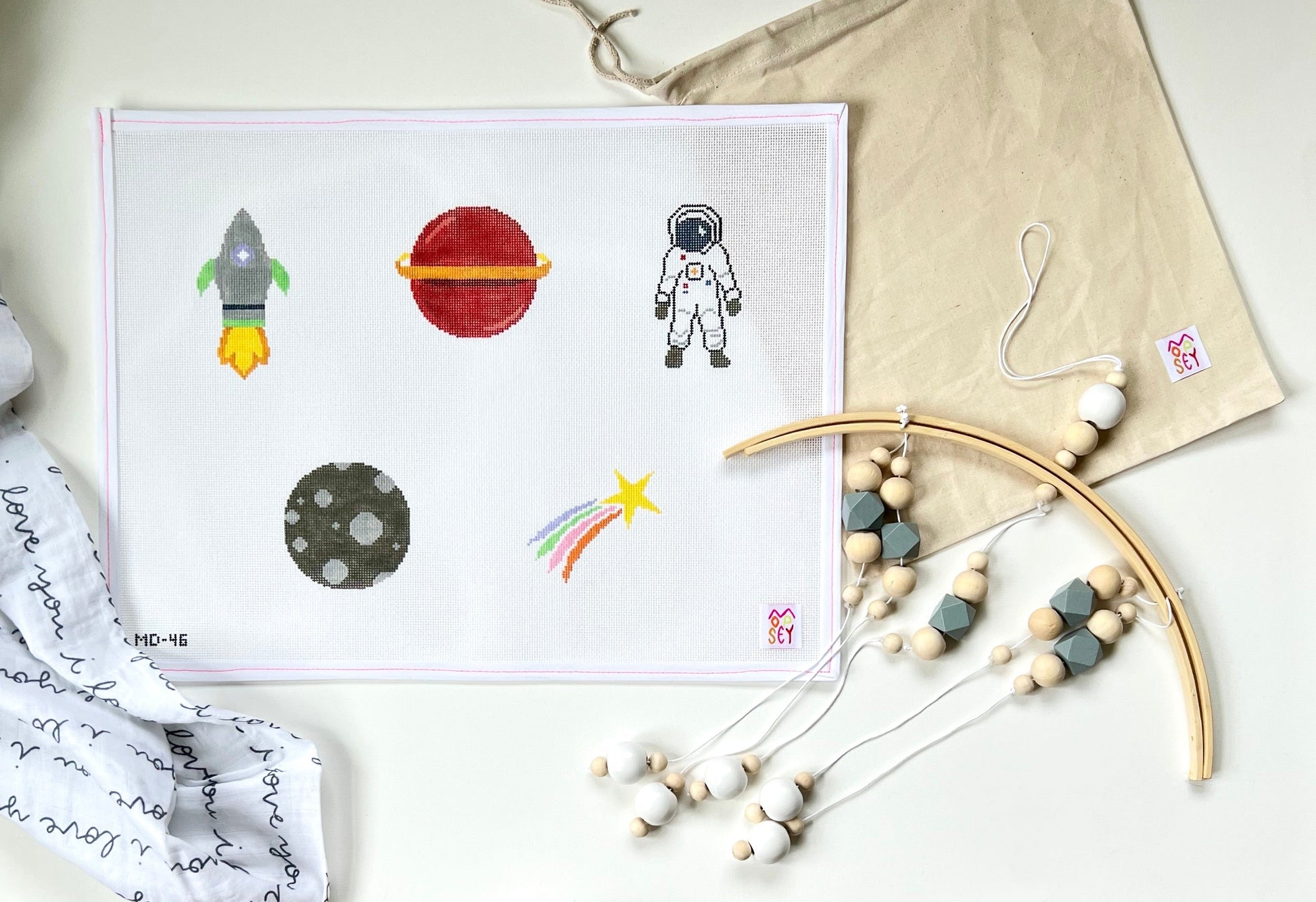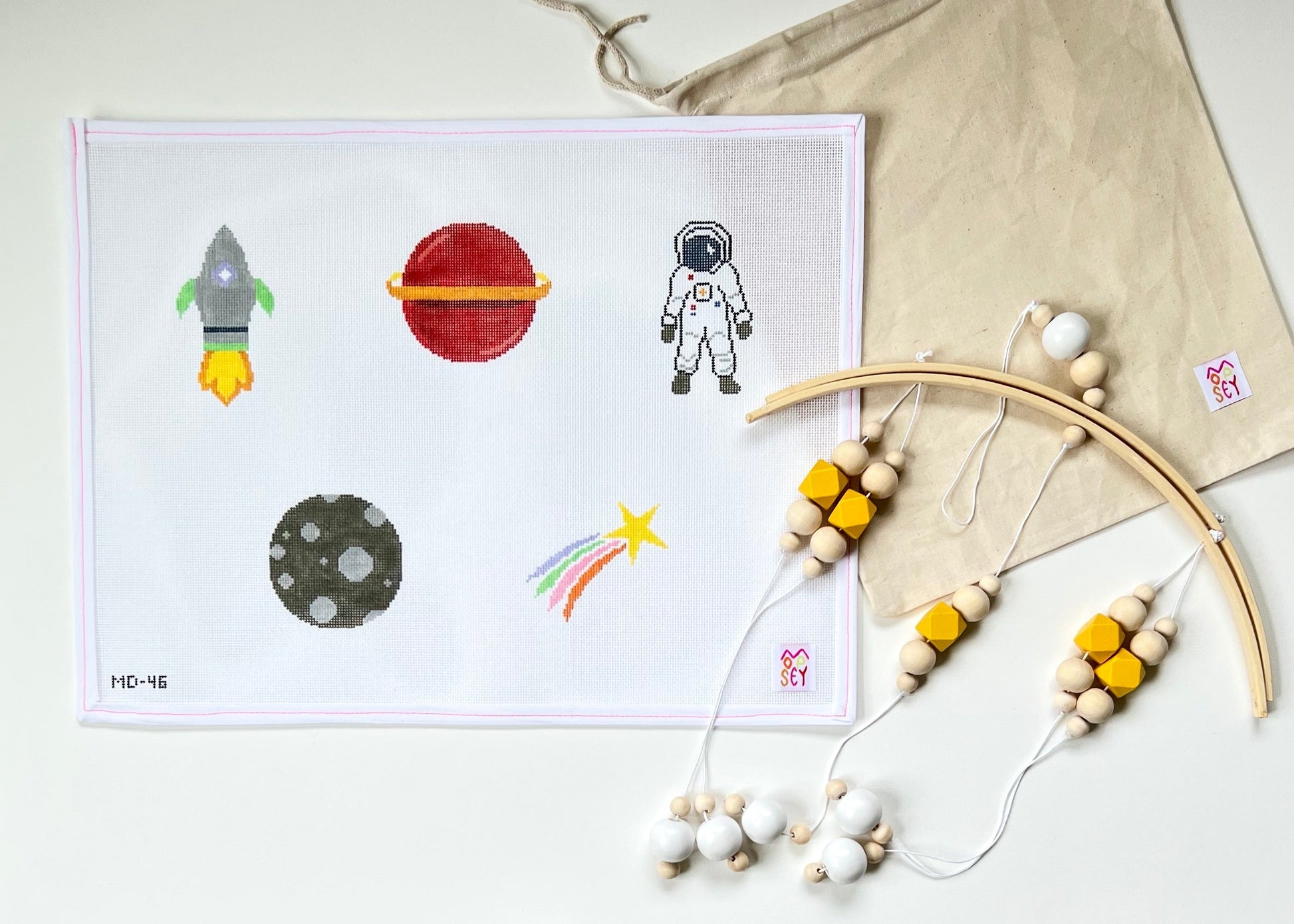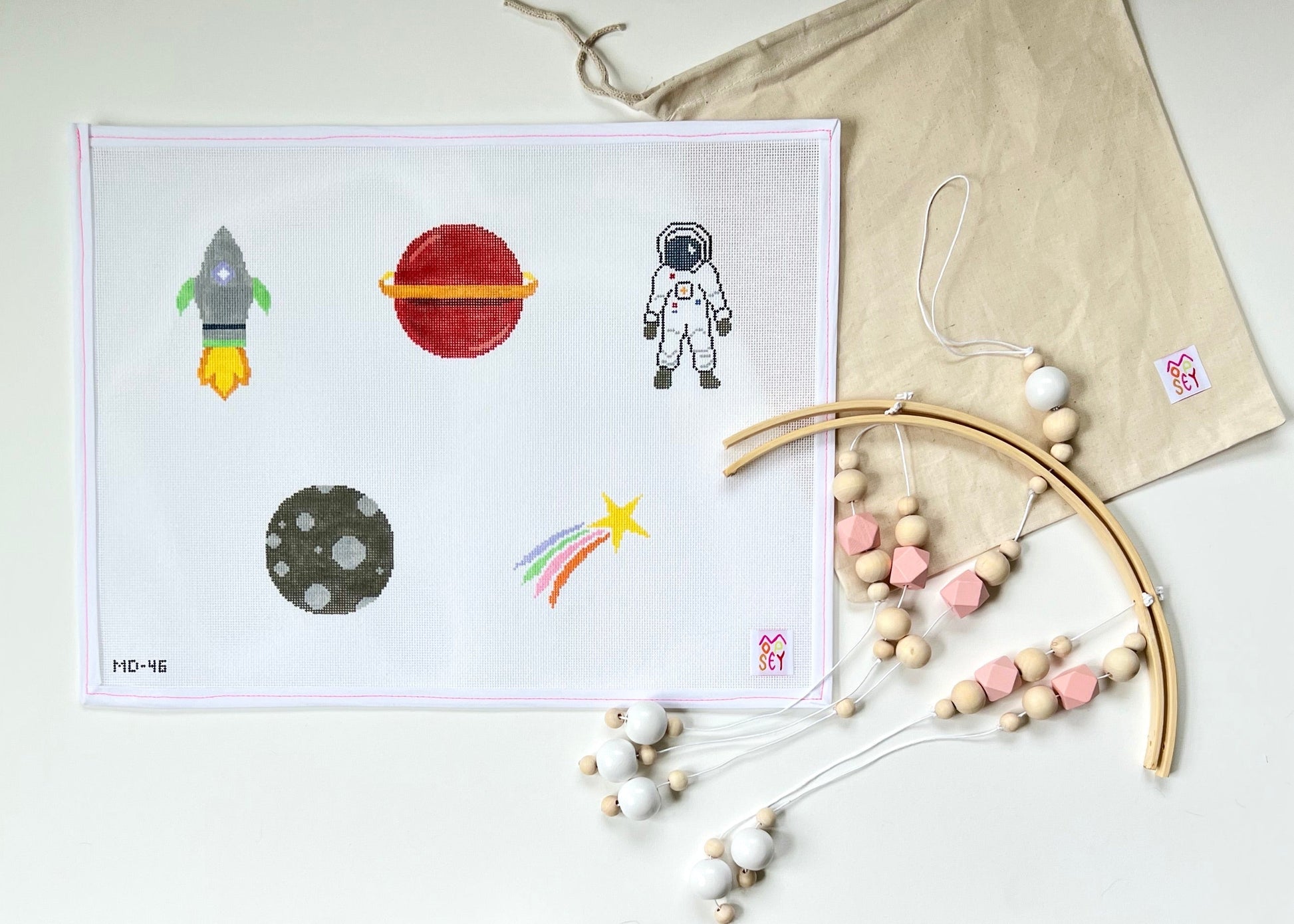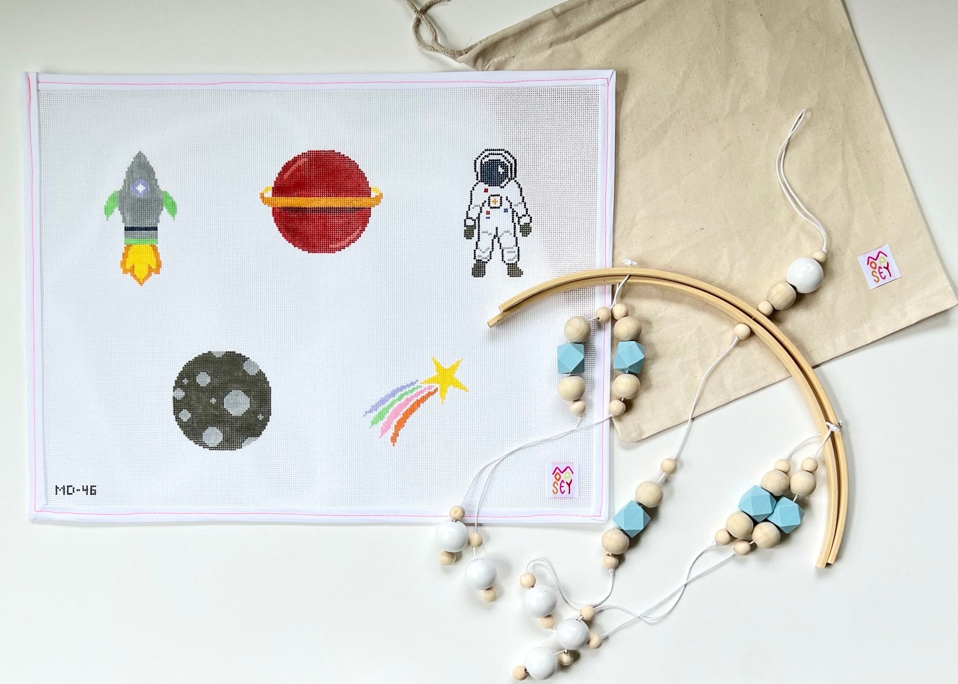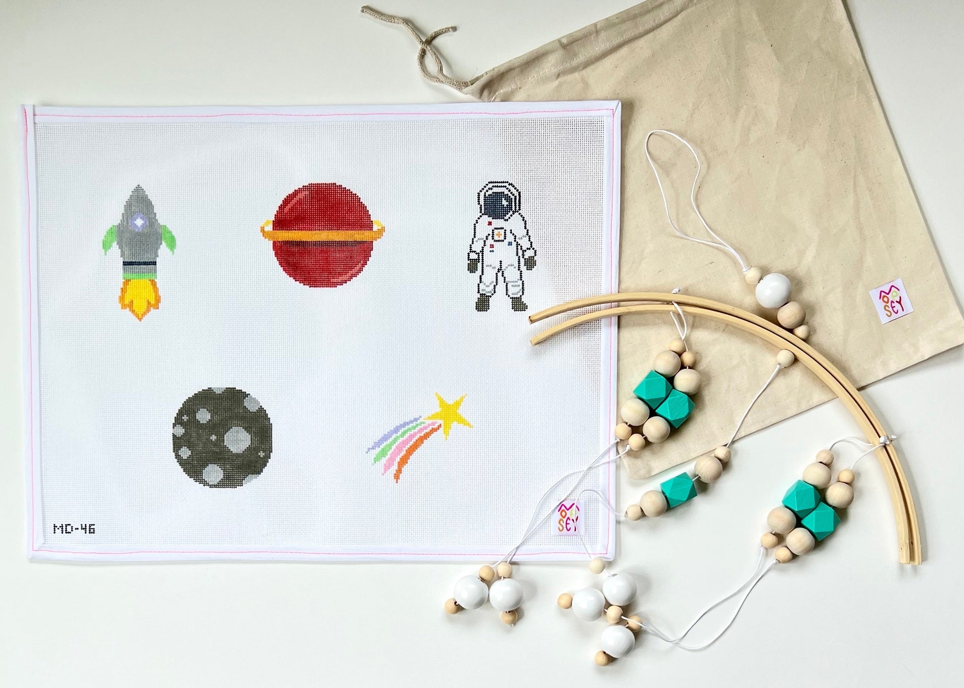 Needlepoint mobiles are here! This is sold as a kit, you will receive the canvas and hardware of your choosing. To have it finished, request a finisher to make flat-back ornaments (with or without a loop) and to attach to the bottom bead of each string on the mobile hardware!