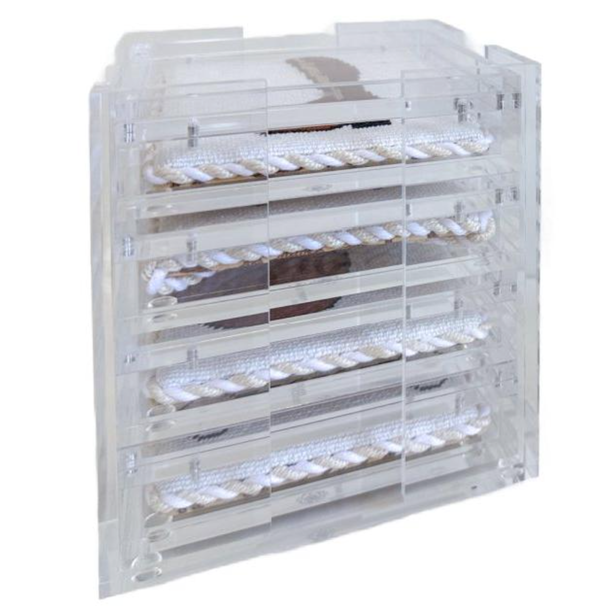 Magnetic acrylic coaster set and holding case for your needlepoint. Both the circle and square have 4.25" inside dimensions (made to accommodate finishing + cording of your standard 4" circle or 4" square needlepoint canvas). The coasters have a small lip on the top to keep your drink from sliding off. Your needlepoint is fully protected and interchangeable with the magnetic closure from the top of the coaster to the base.
